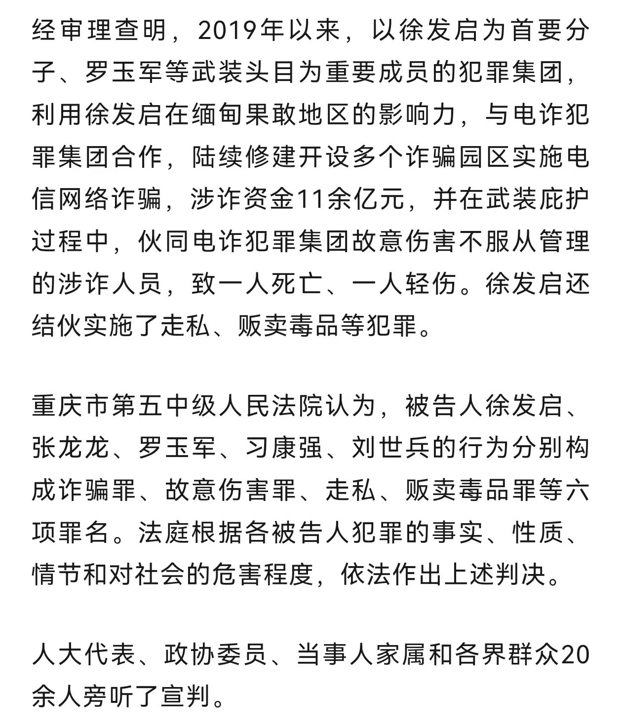 2.缅北徐发启犯罪集团案一审宣判:1月30日,重庆市第五中级人民法院一审公开宣判徐发启犯罪集团案。对被告人徐发启判处死刑,缓期二年执行;对被告人张龙龙判处无期徒刑;对被告人罗玉军、习康强、刘世兵判处二十五年至十四年不等有期徒刑,并相应判处没收财产、罚金等附加刑。详情如下↓(央视新闻)