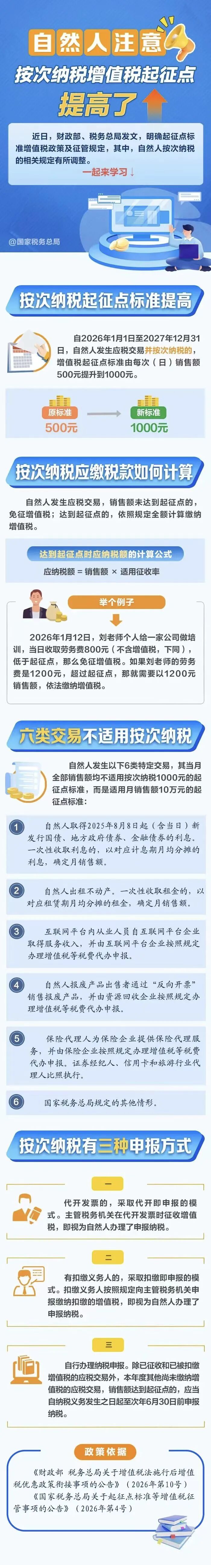 1.自然人注意!按次纳税增值税起征点提高:近日,财政部、国家税务总局发文,明确起征点标准增值税政策及征管规定,其中,自然人按次纳税的相关规定有所调整。一起来学习↓(国家税务总局)