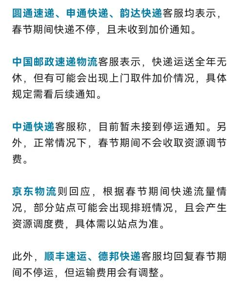 2.“快递停运”登上热搜,多家公司回应:近日,“快递停运”冲上微博热搜,引发部分网民“焦虑”。对此,多家快递企业相继发布春节期间服务安排,宣布将继续提供收派服务,全力满足节日期间的寄递需求。回应如下↓(央广网)