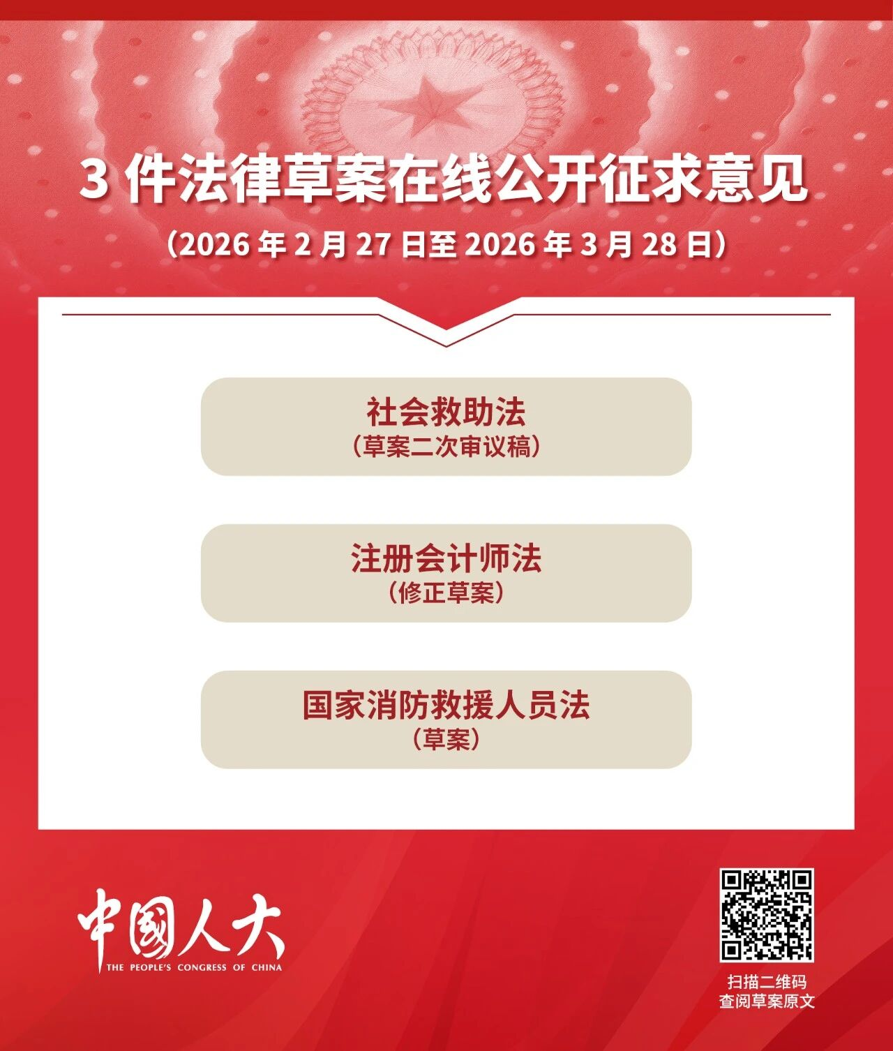 2月27日起,3件法律草案公开征求意见,截止日期为2026年3月28日。您可以登录中国人大网(www.npc.gov.cn)、国家法律法规数据库(flk.npc.gov.cn)提出意见,也可以将意见寄送全国人大常委会法制工作委员会(北京市西城区前门西大街1号,邮编:100805。信封上请注明××法律草案征求意见)。(全国人大)