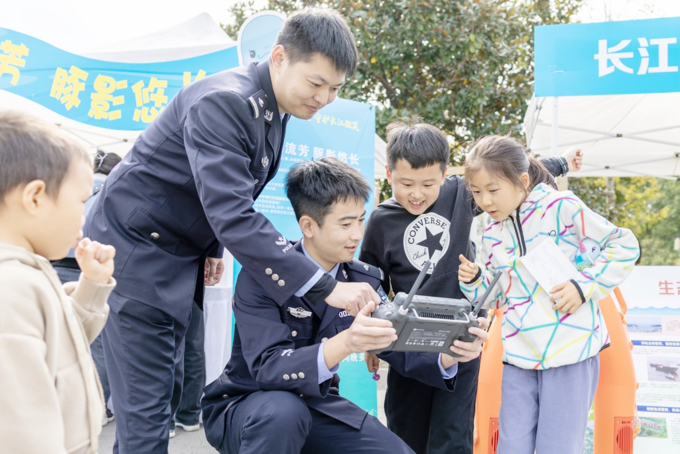 10月26日,镇江长江江豚保护主题月活动启动。长江航运公安局镇江分局联合镇江长江豚类省级自然保护区管理处等多家成员单位,在润州区南山绿集共同开展“聆听江豚欢歌,守护长江微笑”主题宣教活动。图为民警联合相关单位开展无人机巡航等生态警务宣传。 □通讯员 濮方杰 摄