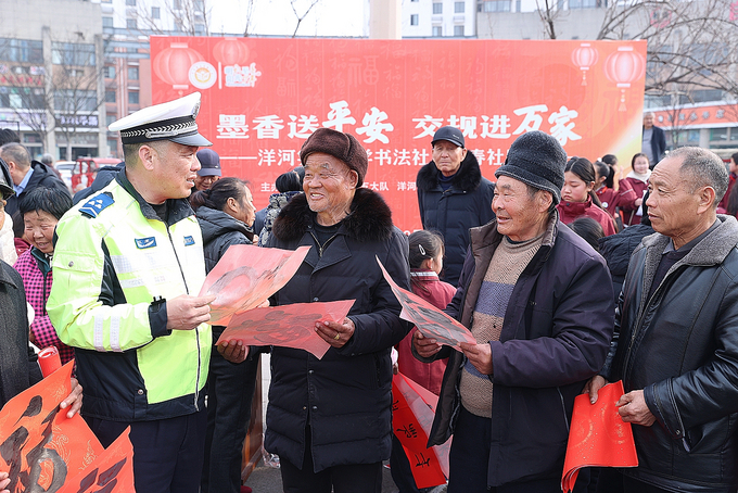 2月5日,宿迁市公安局交通管理支队五大队联合洋河新区实验小学开展“墨香送平安 交规进万家”新春社区行活动。交警和学校师生通过宣传交通安全、义务为群众写春联等形式,在喜庆的祝福中增强群众安全防范意识。□通讯员 王力 摄
