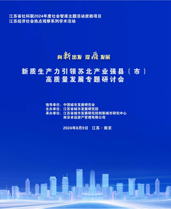8月9日,由中国城市发展研究会指导、江苏省城市发展研究院主办、江苏省城市发展研究院创新城市研究中心和南京卓远资产管理有限公司承办的“新质生产力引领苏北产业强县(市)高质量发展”专题研讨会在南京隆重举行。200多名来自江苏省省级机关和苏北五市及相关区县领导、省委驻苏北地区部分乡村振兴工作队领导和队员、全国各地的业界专家学者、企业家代表、头部金融机构代表参加了会议。会议紧紧围绕新质生产力赋能下的苏北地区产业强县(市)之路展开研讨。