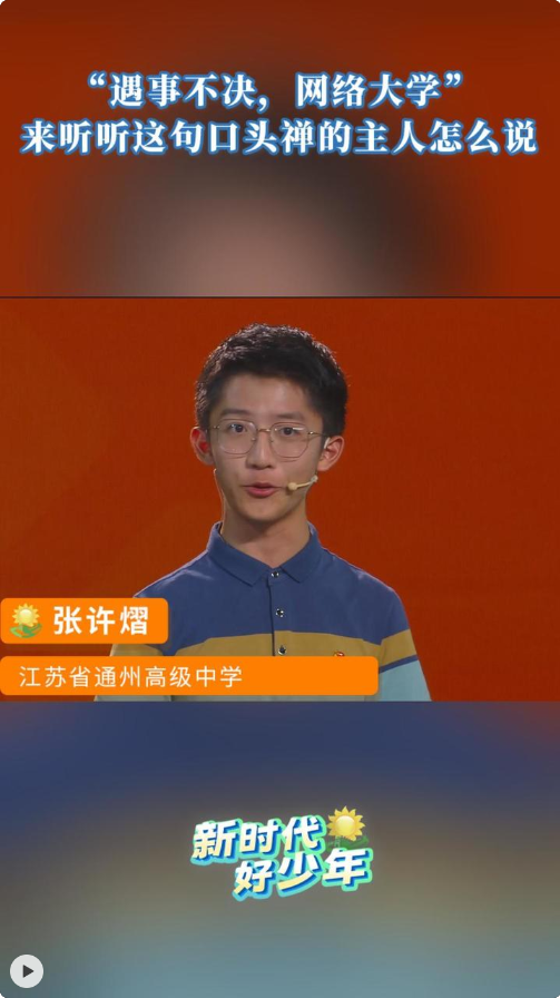 8月15日晚,筑梦中国少年行2024年全国“新时代好少年”先进事迹发布仪式在江苏南通举行。学习创造“小达人”张许熠喜欢用镜头记录和分享自己的学习生活,“遇事不决,网络大学”是他的一句口头禅,什么意思呢?