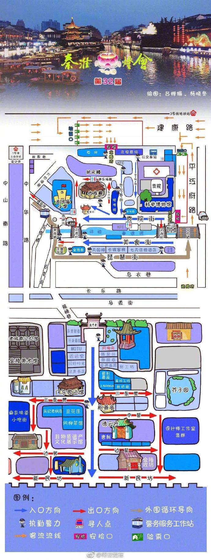 @平安南京发布了“秦淮灯会手绘地图”,出入口、客流流线、警务服务工作站、安检验票口……
