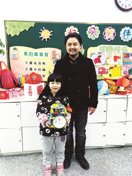 李先生和女儿一起展示花灯