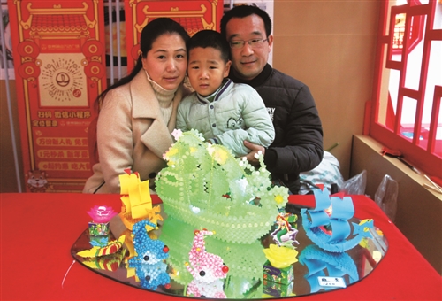 祁瀚墨和父母展示“一帆风顺”花灯