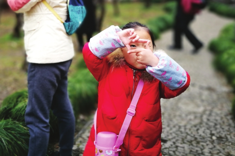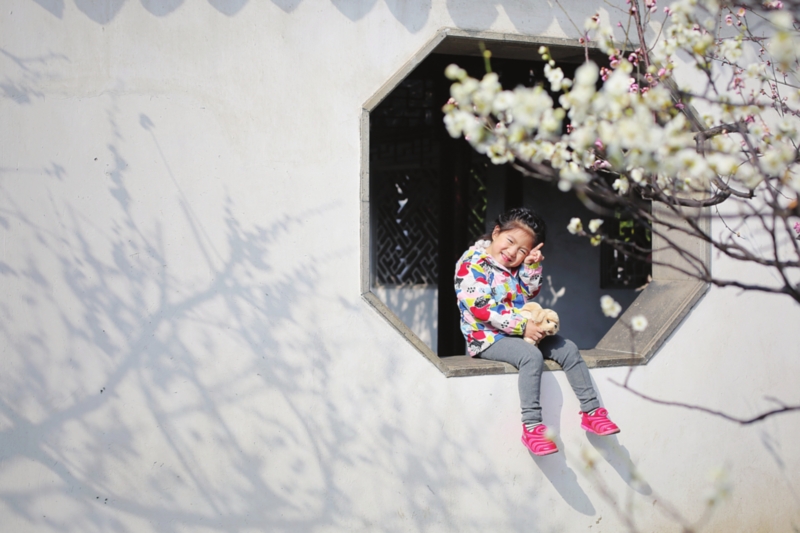 怡园梅圃,坐上花窗的小姑娘对着镜头露出灿烂的微笑。吉力摄