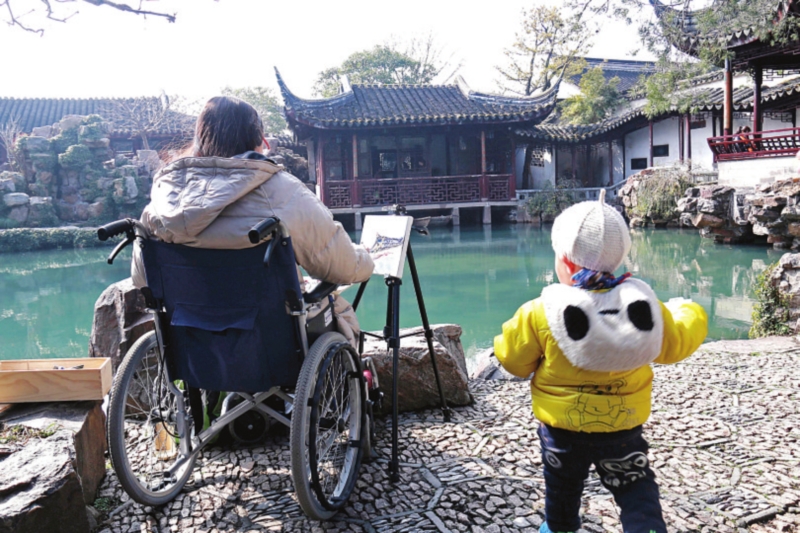 孩童饶有兴致地观看姐姐作画。潘治明摄