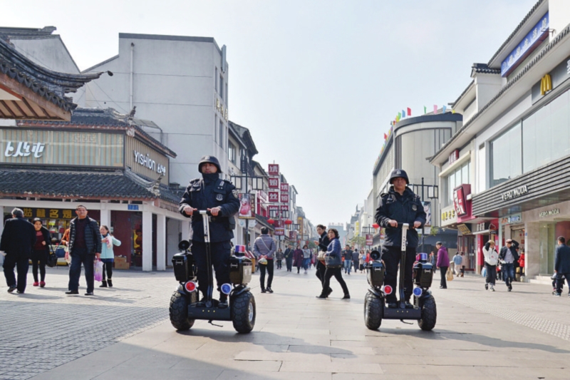 观前街上,脚踩“风火轮”执勤巡逻的民警。马耀明摄