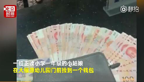 【“我在马路边捡到5000多元钱 交到警察蜀黍手里面”】3月1日,江苏徐州,一位正读小学一年的6岁女孩捡到一个钱包,随后在妈妈的陪伴下,把钱包交给警察叔叔。民警打开钱包,发现里面有5200元现金等物。蜀黍已经联系到失主,并给这位拾金不昧的小朋友打call点赞。