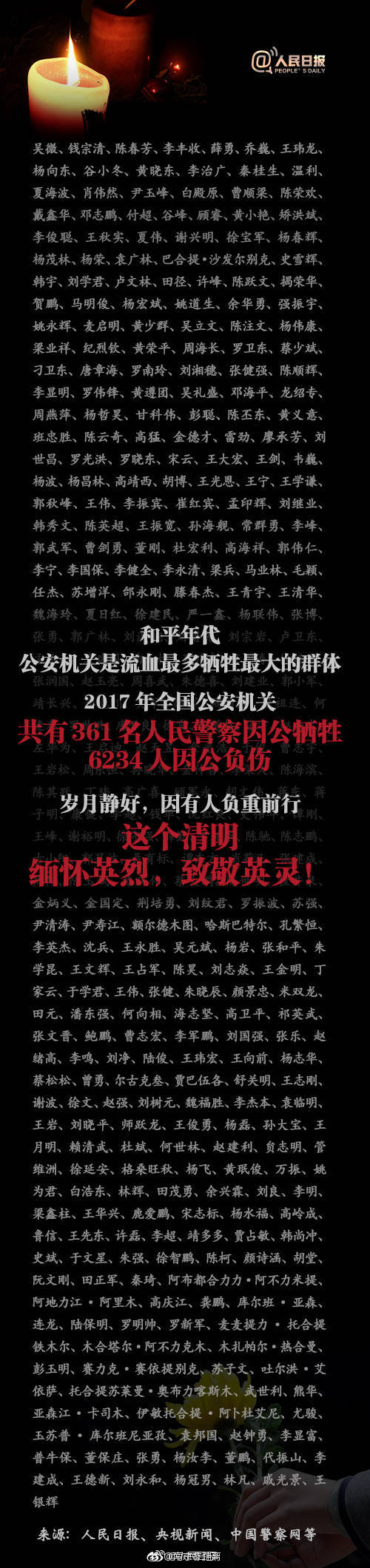 警察,是和平年代流血最多的职业群体。2017年,全国有361名民警因公牺牲,几乎平均每天就有一位。面对受伤甚至死亡,他们也会怕,但困难危急之时,却义无反顾,不曾退缩。平安从不会从天而降,是他们守护万家灯火负重前行 。今日清明,转发缅怀,致敬英雄!