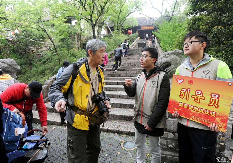 4月6日,苏州大学轨道交通学院和苏州农业职业技术学院共75名大学志愿者分批来到虎丘山景区开展志愿服务活动,给前来游园的游客提供文明旅游咨询、文明引导、爱心义卖等志愿服务。
