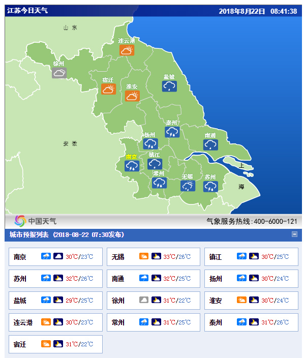受“苏力”外围云系影响,今天大家要关注雷阵雨以及大风天气。今天全省多云到阴,大部分地区有分散性阵雨或雷雨,其中淮河以南地区局部雨量大到暴雨,具体气温如下:南京 30℃/23℃ 无锡 33℃/26℃ 镇江 30℃/25℃ 苏州 32℃/26℃ 南通 32℃/25℃ 扬州 30℃/24℃ 盐城 29℃/25℃ 徐州 31℃/22℃ 淮安 30℃/24℃ 连云港 30℃/23℃ 常州 31℃/25℃ 泰州 31℃/26℃ 宿迁 31℃/22℃