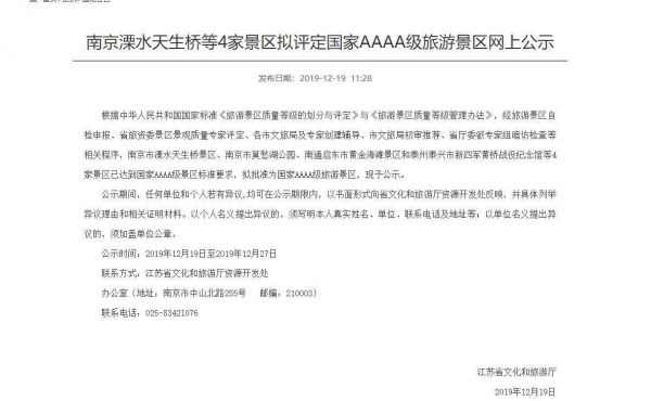 根据江苏省文化和旅游厅2019年12月19日的公示,启东市黄金海滩景区、南京市溧水天生桥景区、南京市莫愁湖公园和泰兴市新四军黄桥战役纪念馆等4家景区通过审核,拟批准为国家4A级景区。