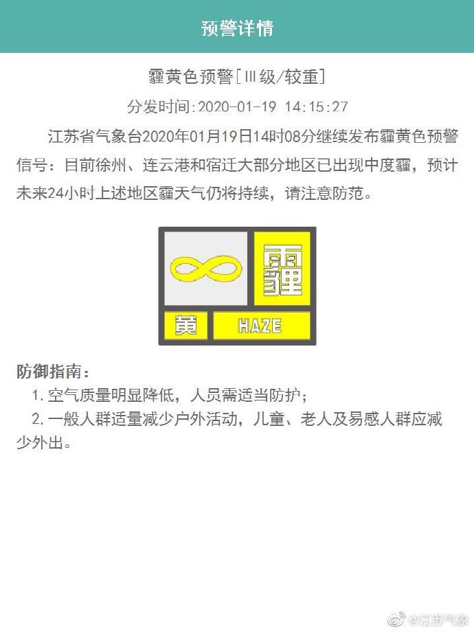 江苏省气象台2020年01月19日14时08分继续发布霾黄色预警信号:目前徐州、连云港和宿迁大部分地区已出现中度霾,预计未来24小时上述地区霾天气仍将持续,请注意防范。