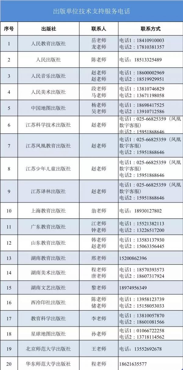 依据教育部《关于认真做好疫情防控期间教学用书供应工作的通知》和《关于发布中小学国家课程教材电子版链接的通告》要求,针对江苏省内中小学所使用的教材,我省决定公布各教材编写出版单位提供的免费电子版教材链接、教材出版单位技术支持服务电话(具体见下方二维码和图表)。