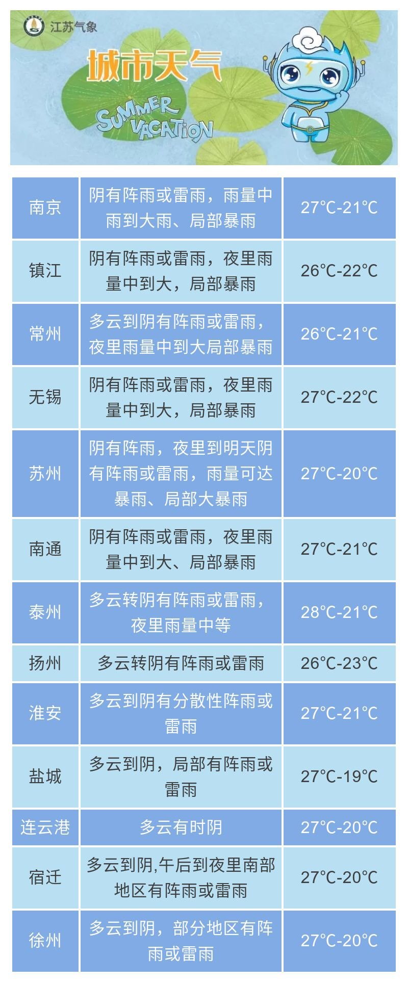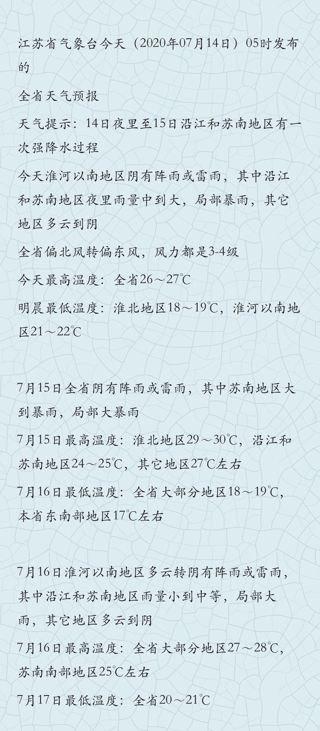 据预报,14日夜里至15日沿江和苏南地区有一次强降水过程,今天淮河以南地区阴有阵雨或雷雨,其中沿江和苏南地区夜里雨量中到大,局部暴雨,其它地区多云到阴,全省偏北风转偏东风,风力都是3-4级,今天最高温度:全省26~27℃,明晨最低温度:淮北地区18~19℃,淮河以南地区21~22℃ 。