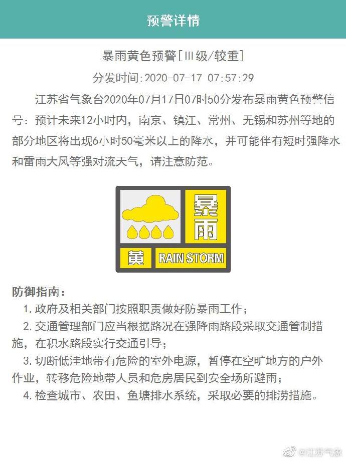 江苏省气象台2020年07月17日07时50分发布暴雨黄色预警信号:预计未来12小时内,南京、镇江、常州、无锡和苏州等地的部分地区将出现6小时50毫米以上的降水,并可能伴有短时强降水和雷雨大风等强对流天气,请注意防范。