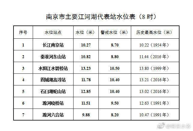 今日8时,长江南京站水位10.26米(警戒水位8.70米),超警戒1.56米,今年以来最高潮位10.31m(7月19日)。水阳江水碧桥站13.24米,超警戒2.74米、超保证0.44米;今年以来最高水位达到13.36米(7月17日)。石臼湖蛇山站12.81米,超警戒2.41米,超保证水位0.31米,今年以来最高水位达到12.91米(7月18日)。秦淮河东山站10.66米,超警戒1.86米,最高水位达到11.04米(7月18日)。滁河晓桥站11.97米,超警戒2.47米;滁河六合站9.96米,超警戒1.76米;固城湖高淳站12.07米,超警戒1.67米。