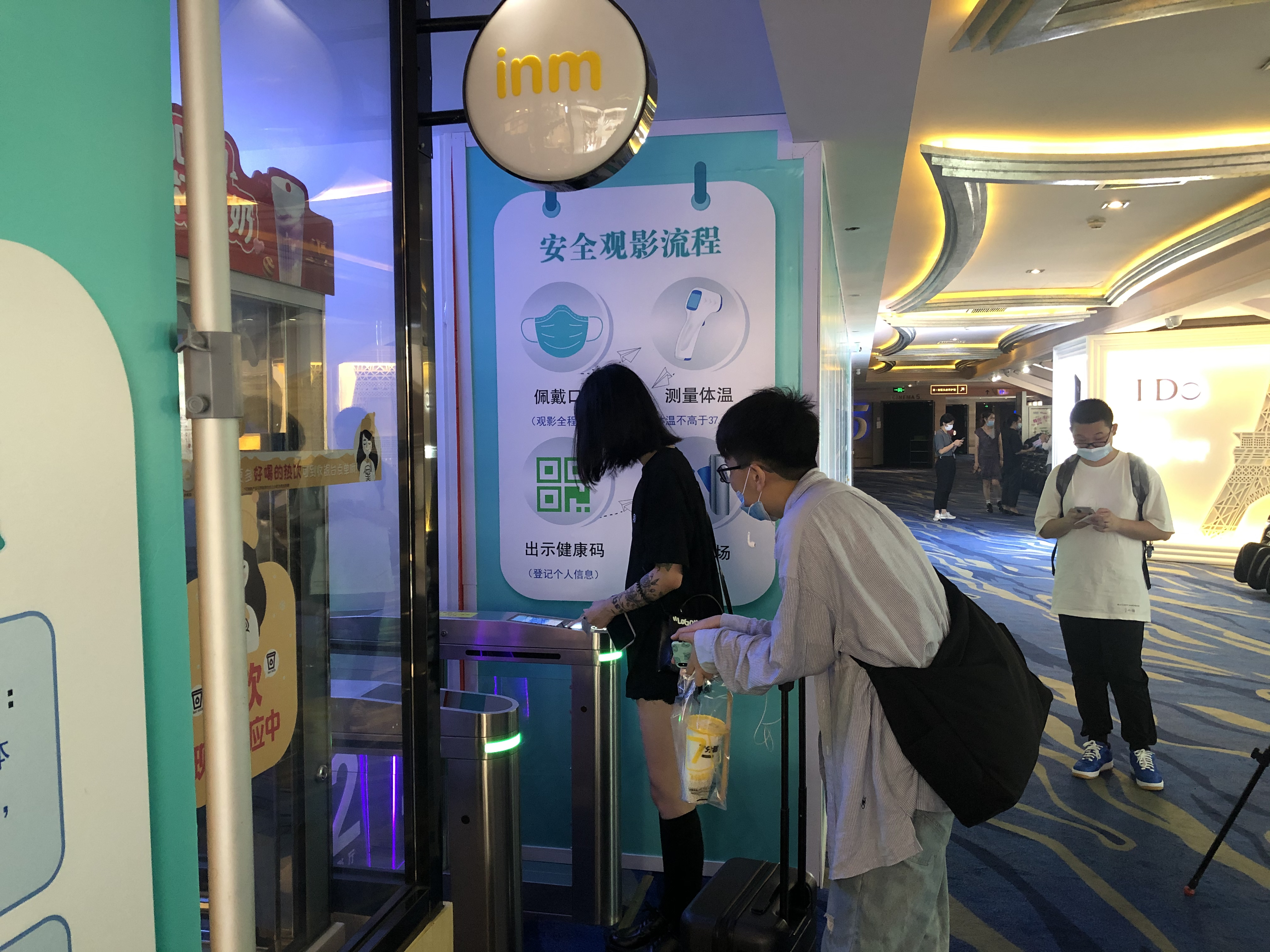 每场开映前,观众有序排队,出示健康码,测量体温,无人检票扫码进场。在观影队伍中,几乎全是年轻人,甚至还有一对情侣带着行李箱来观影,在电影开场前20分钟就急切地想刷票进场。