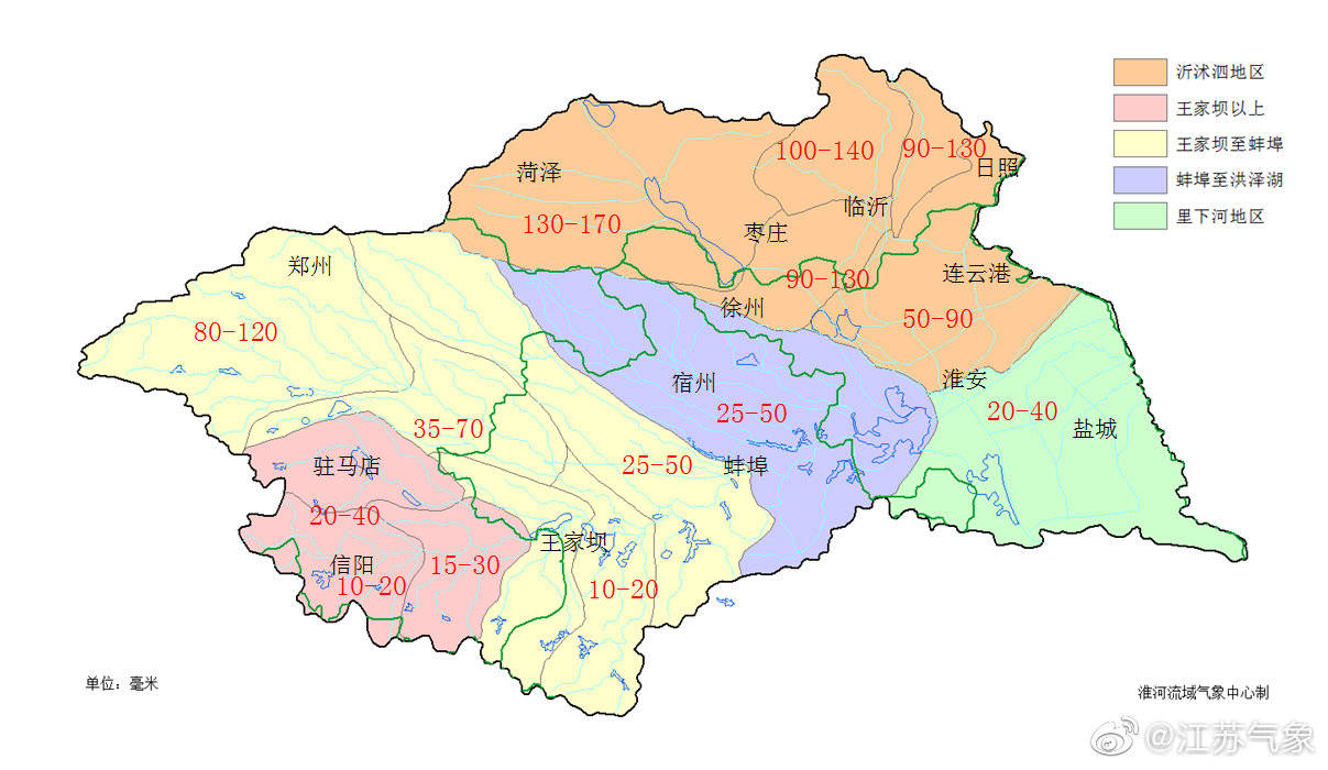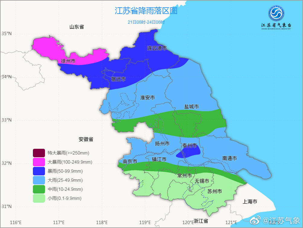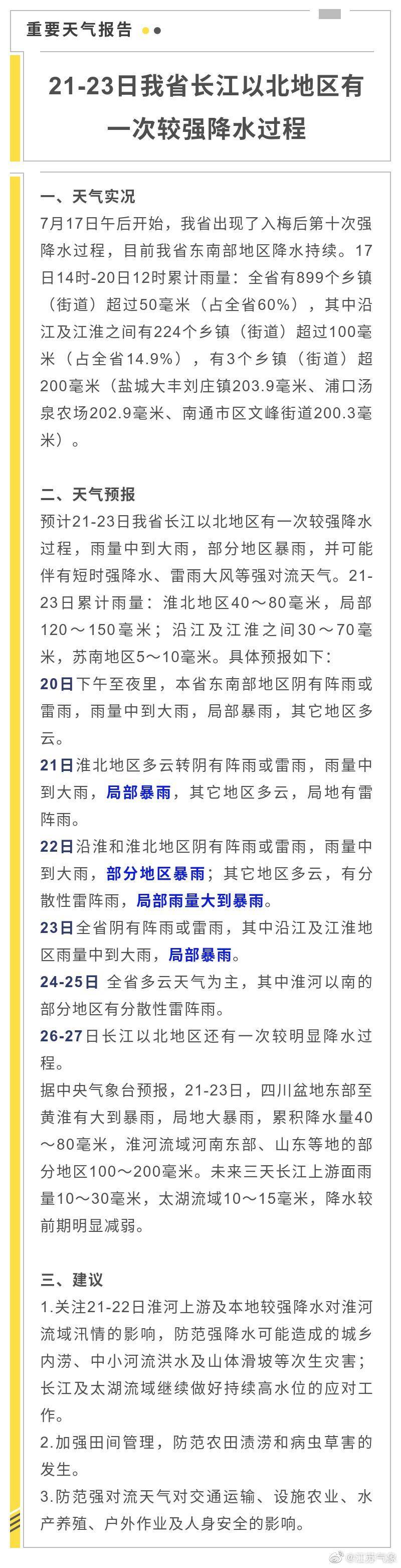 据最新气象资料分析, 预计21-23日江苏长江以北地区有一次较强降水过程,雨量中到大雨,部分地区暴雨,并可能伴有短时强降水、雷雨大风等强对流天气。21-23日累计雨量:淮北地区40~80毫米,局部120~150毫米;沿江及江淮之间30~70毫米,苏南地区5~10毫米。(记者 于丹丹)