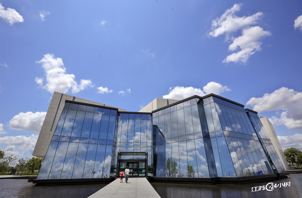 7月29日,苏州市,蓝天白云水晶天映衬在吴文化博物馆的玻璃幕墙上,犹如一幅美丽的图画。