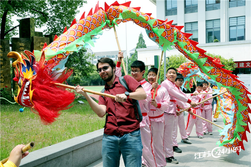4月28日,苏州某高校留学生来到苏州市带城实验小学,和小学生一起体验舞龙、泥塑、版画等非遗项目,感受中国传统文化的魅力。