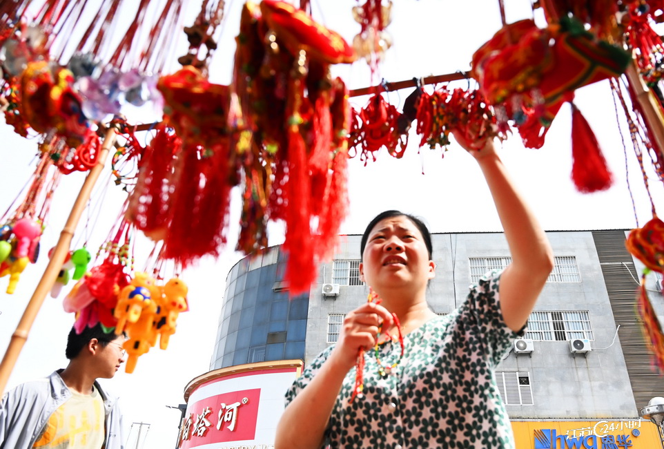 6月21日,端午节即将来临,在徐州市睢宁县城步行街,一串串制作精巧的香包吸引市民选购。