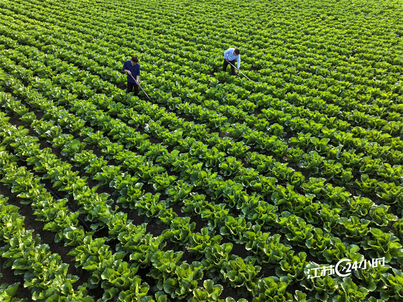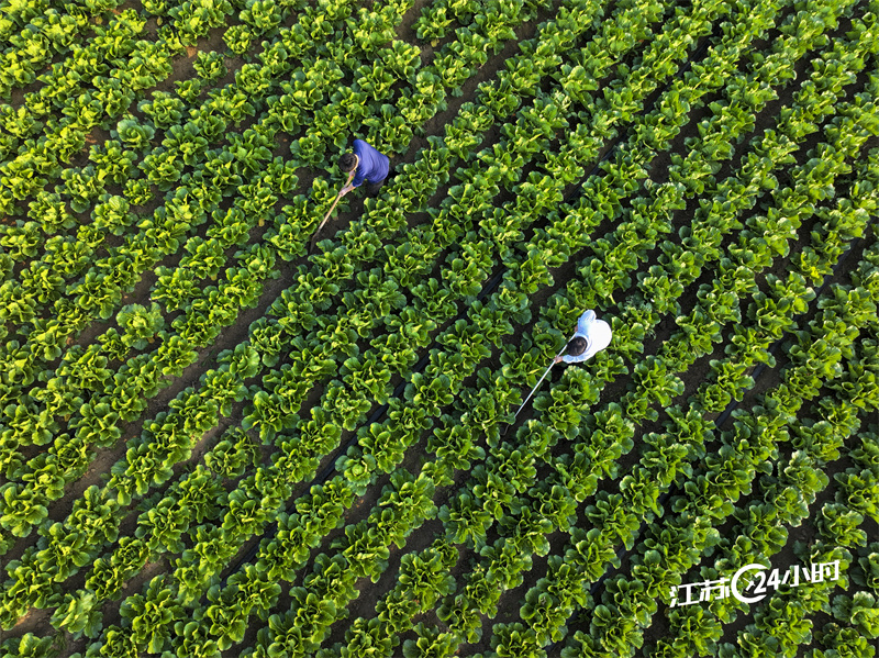 10月17日,工作人员正在邳州市铁富镇艾山后村白菜种植基地进行田间管护。目前,该基地种植的近300亩白菜长势良好,收获后将销往江苏徐州、山东等地。(特约摄影高刚杨夫垒8:38摄8:50上线)
