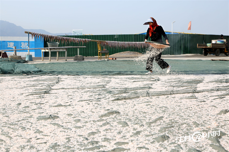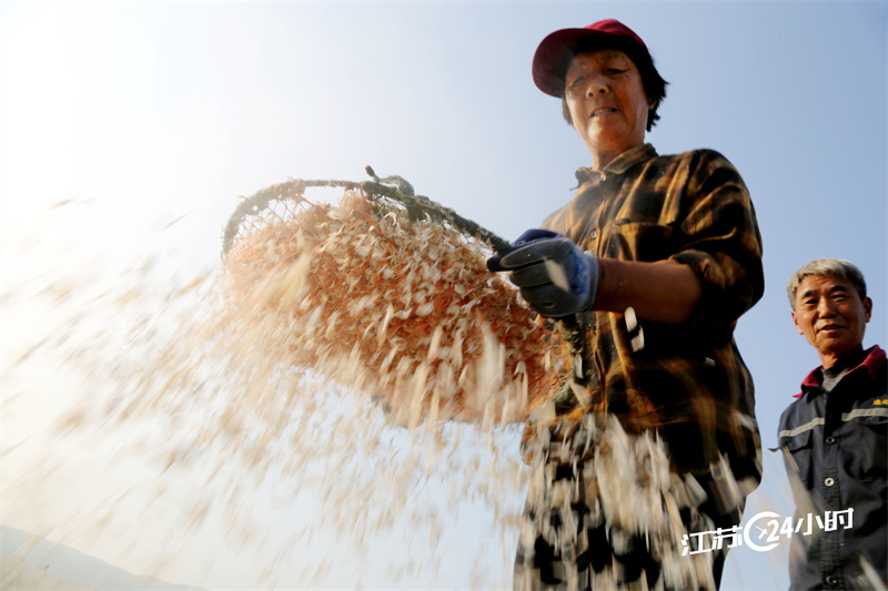 10月17日,连云港市连云区海岛渔民正在晾晒虾皮、加紧制作虾皮,准备销往市场。