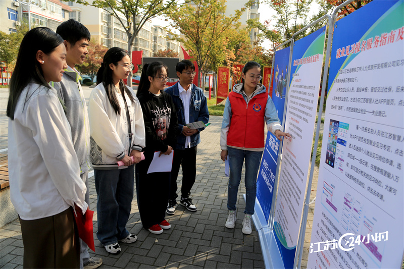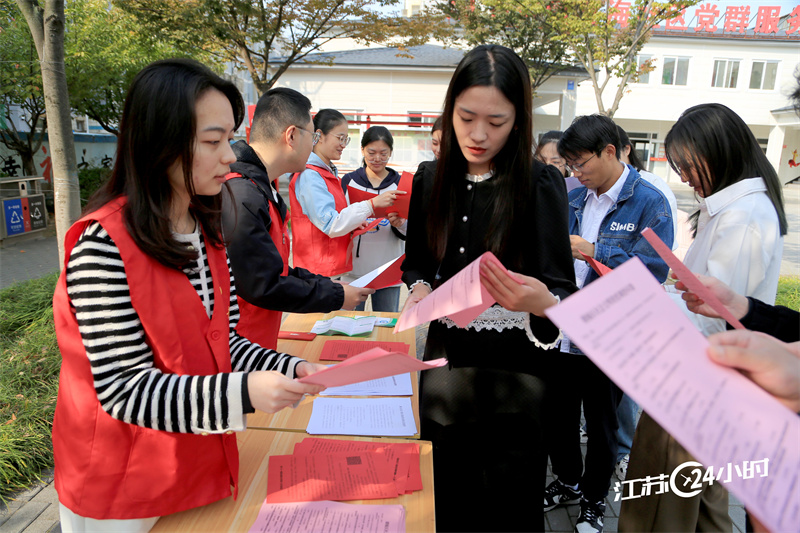 10月17日,连云港市赣榆区人社局人才中心组织工作人员,联合青口镇“海英草”志愿者在黄海社区开展就业见习政策宣传,为毕业生发放就业见习宣传资料,宣传就业创业、劳动权益保障等相关政策,并提供求职服务。(特约摄影邵世新 李健9:09摄10:30上线)