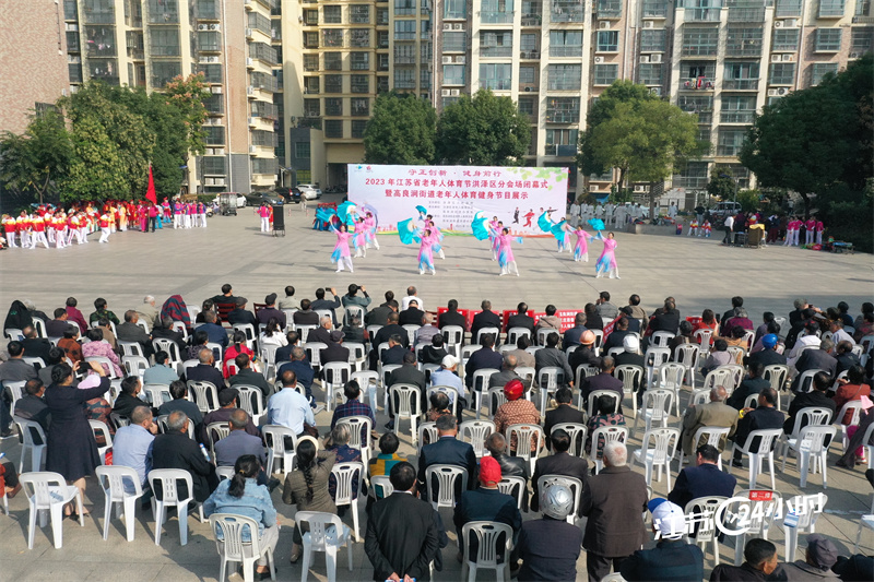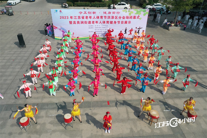 10月17日,2023年江苏省老年体育节洪泽区分会场闭幕式暨高良涧街道老年人体育健身节目展示活动在淮安市洪泽区洪建社区盛世华庭小区举行。来自高良涧街道的老年人健身团队表演了舞蹈、健身气功、腰鼓等节目,丰富居民文化生活。(特约摄影崔德圣刘彬9:56摄11:15上线)