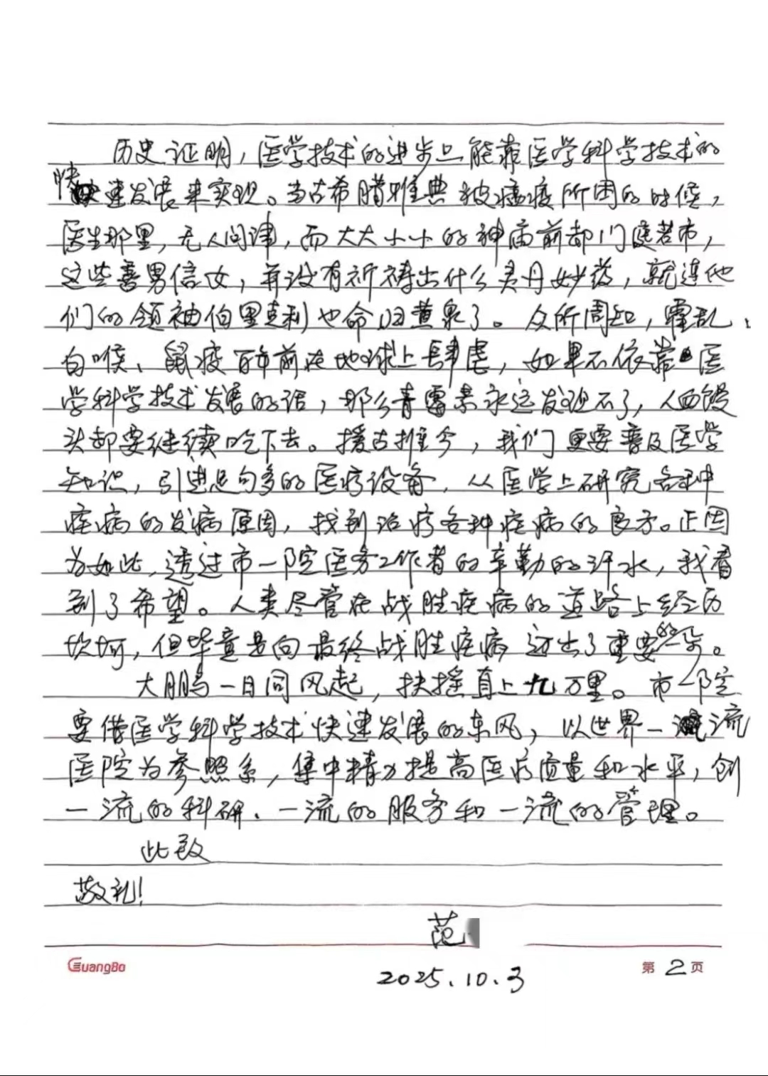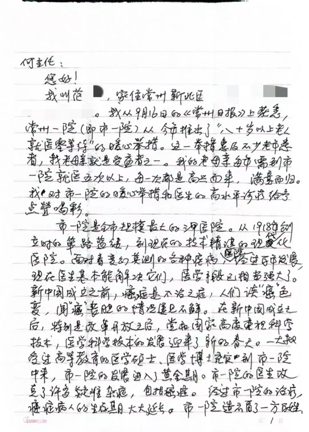 近日,市民范先生手写一份表扬信,点赞常州一院今年推出的“八十岁以上老人就医零等待”的暖心举措和医生的高水平诊疗行为。“暖心举措惠及不少老年患者,我老母亲就是受益者之一。她每年需到市一院就医五次以上,每一次都是高兴而来,满意而归。”信中的字字句句,不仅是对常州一院医疗服务的肯定,更是医院用心守护高龄患者就医路的生动缩影。