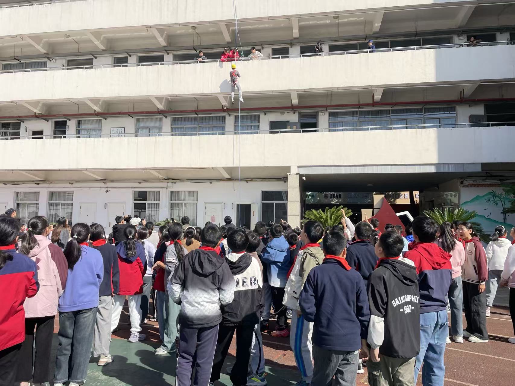 在绳索逃生体验区,气氛紧张而热烈。两名同学主动请缨,在消防员的专业指导和严密的安全防护下,克服了高空带来的紧张感,按照所学技巧抓握绳索、稳步下降,动作规范有序。当他们安全落地时,现场响起了阵阵掌声。这一环节不仅锻炼了同学们的应急反应能力,更让大家直观感受到掌握逃生技能的重要性。