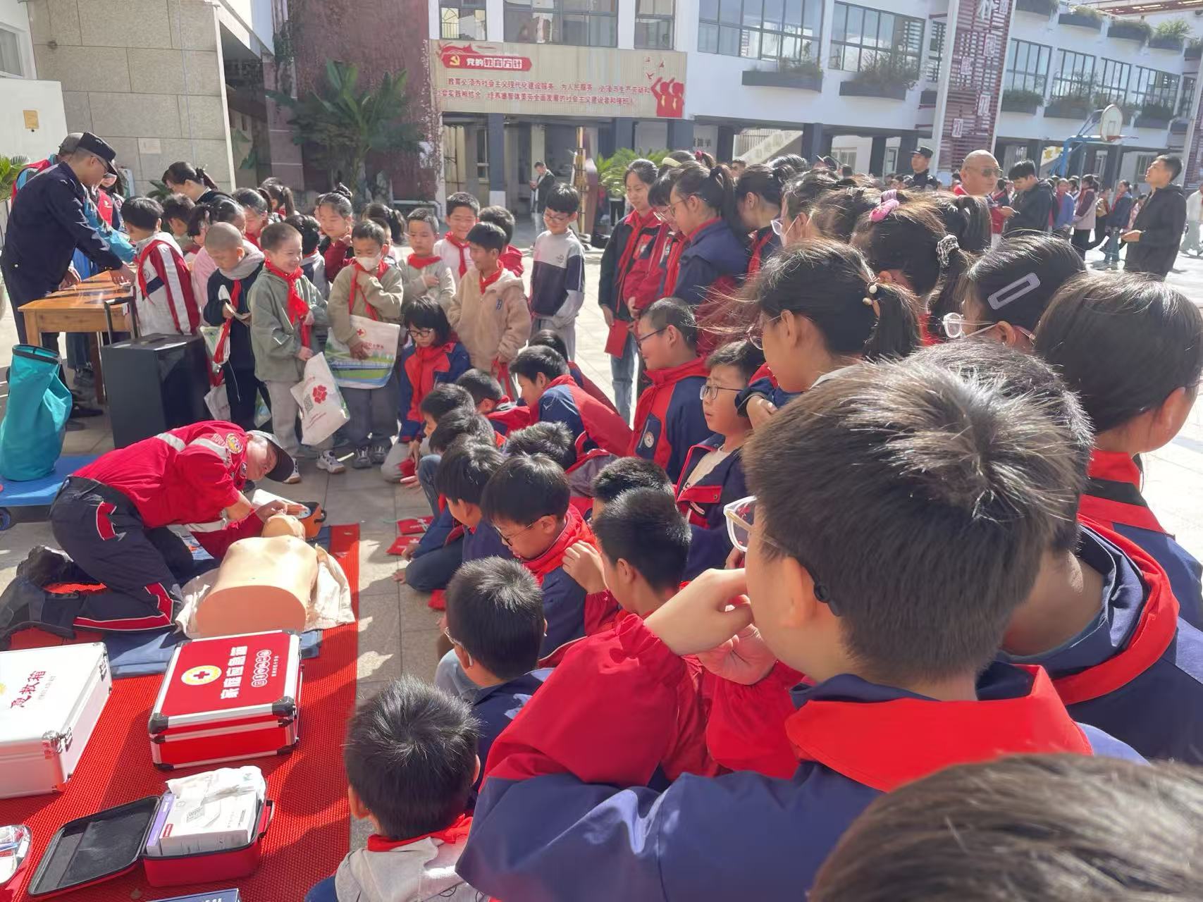 户外安全课堂上,灭火器、防毒面具、急救箱等各类消防与急救装备整齐陈列。倪老师逐一介绍了这些器材的用途与操作方法,并重点演示了心肺复苏的完整流程,从判断意识、胸外按压到人工呼吸,每个步骤都清晰明了。同学们分组进行模拟练习,在实践中熟练掌握了急救技巧,增强了自救互救的底气。