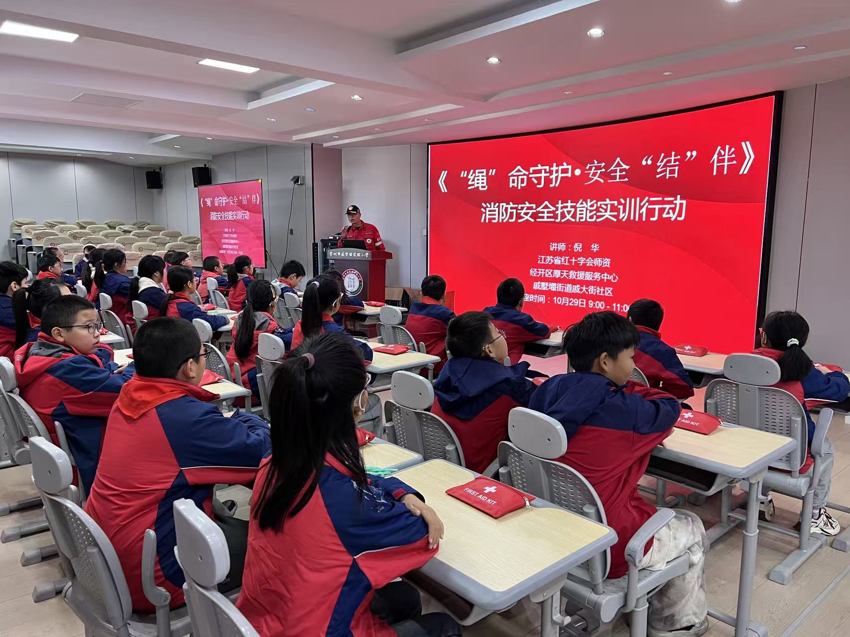 活动伊始,江苏省红十字会的倪华老师为同学们带来了一堂生动的消防知识讲座。他结合近期发生的真实火灾案例,用通俗易懂的语言,详细讲解了火灾逃生的核心要点,如“低姿弯腰捂口鼻”“辨明疏散方向”“切勿乘坐电梯”等。随后,倪老师还现场教授了平结、活结等实用绳结的打法,同学们听得专注,练得认真,指尖翻飞间便掌握了紧急避险的关键技能。