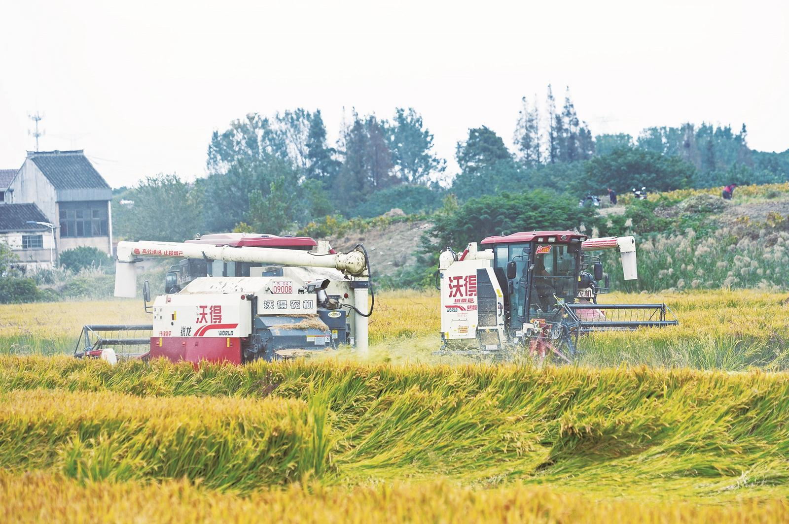 风吹稻浪翻金浪,收割正忙庆丰年。11月4日下午,虽然天气阴沉,但是横林镇李家塘的20多亩稻田里却是热火朝天:几台收割机往来穿梭,沉甸甸的稻穗在机械轰鸣中化作饱满的谷粒。这里种植的是优质品种南梗46,今年亩产稳定在800斤左右。种粮大户朱洪良望着丰收的稻田满脸笑意,他在常州经开区承包了1300多亩水稻,尽管今夏高温对产量略有影响,但近期晴好天气助力水稻长势喜人。目前,朱洪良正组织力量全力以赴抢收,力争在11月底完成全部收割工作,确保颗粒归仓。