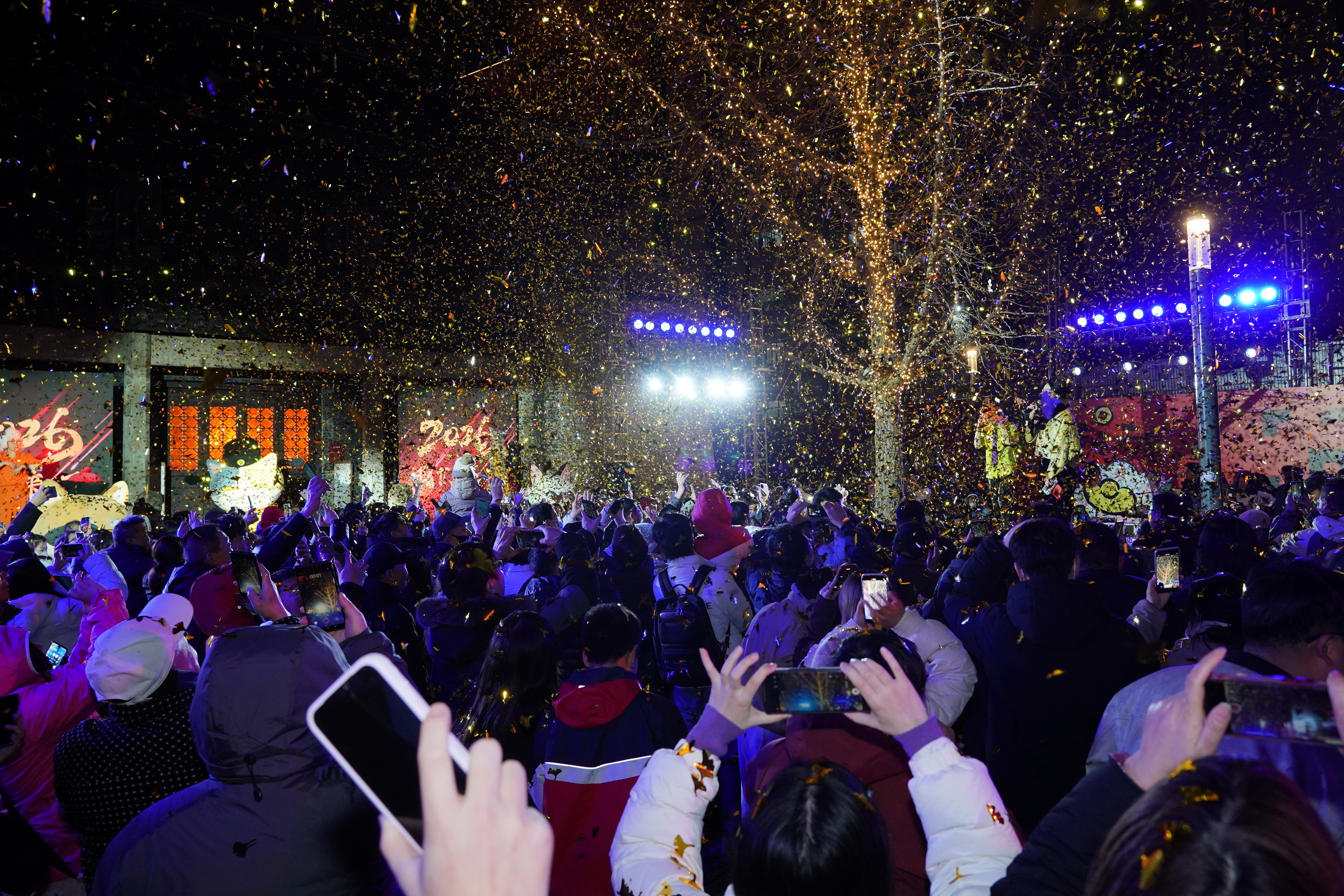 跨年夜的压轴环节温情又浪漫,养生跨年氛围拉满。数百名市民齐聚古银杏下,无需熬夜守候,伴随着千万片银杏叶缓缓飘落,在舒适惬意的氛围中共同倒数迎接2026年的到来,默默许下新年愿望。整场活动中,由新运文旅精心筹备的多轮互动抽奖环节持续升温,100余份神秘好礼送不停,丰厚奖品惊艳全场——一等奖为999足金金元宝,还有青枫苑酒店豪华房券、玉蝶萝卜干和康王芝麻糖非遗好礼、城隍喵文创套装等重磅好礼轮番送出,让幸运市民收获新年满满好彩头,现场欢呼声、祝福声此起彼伏。