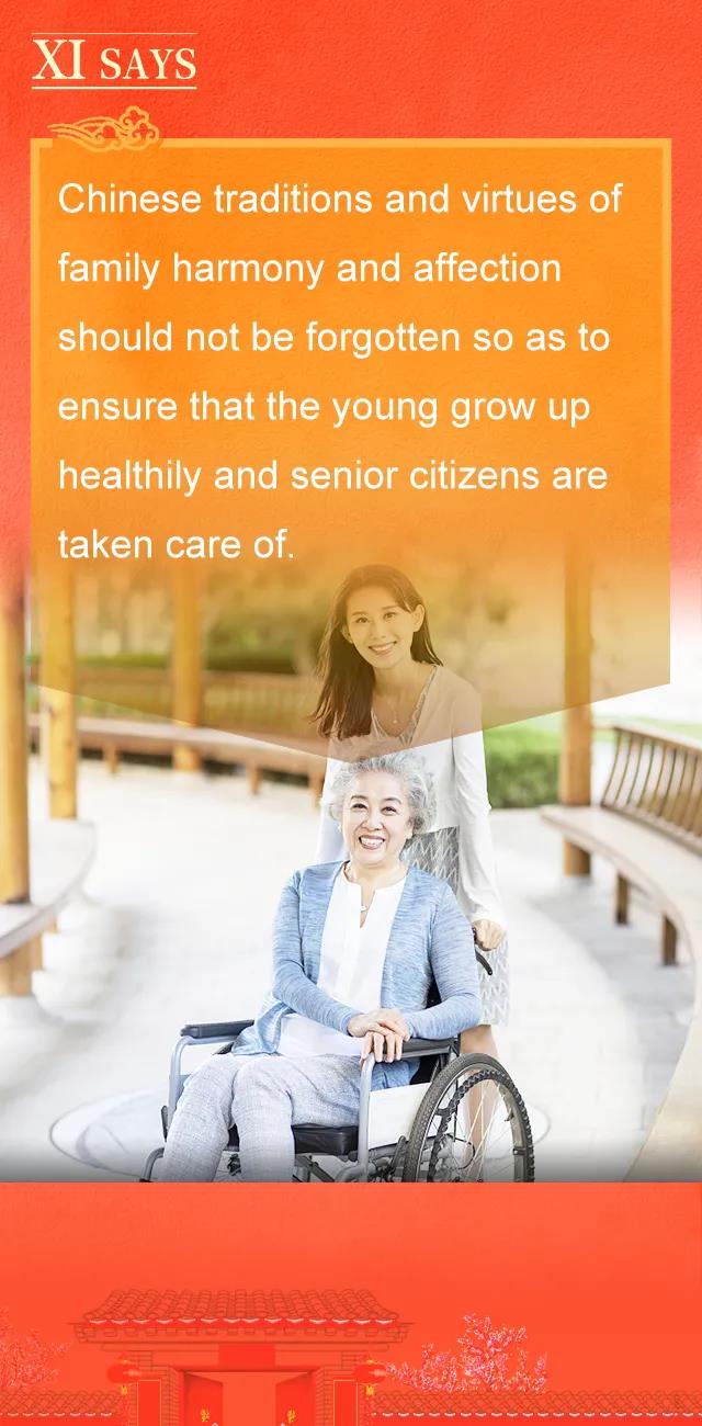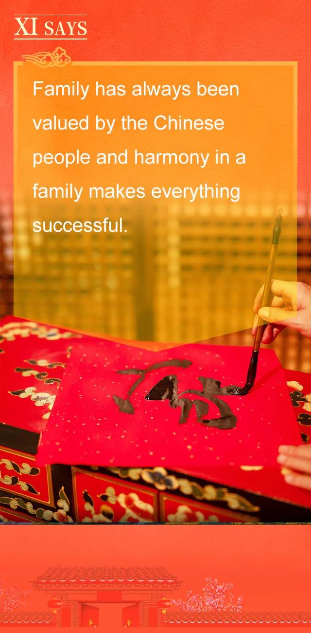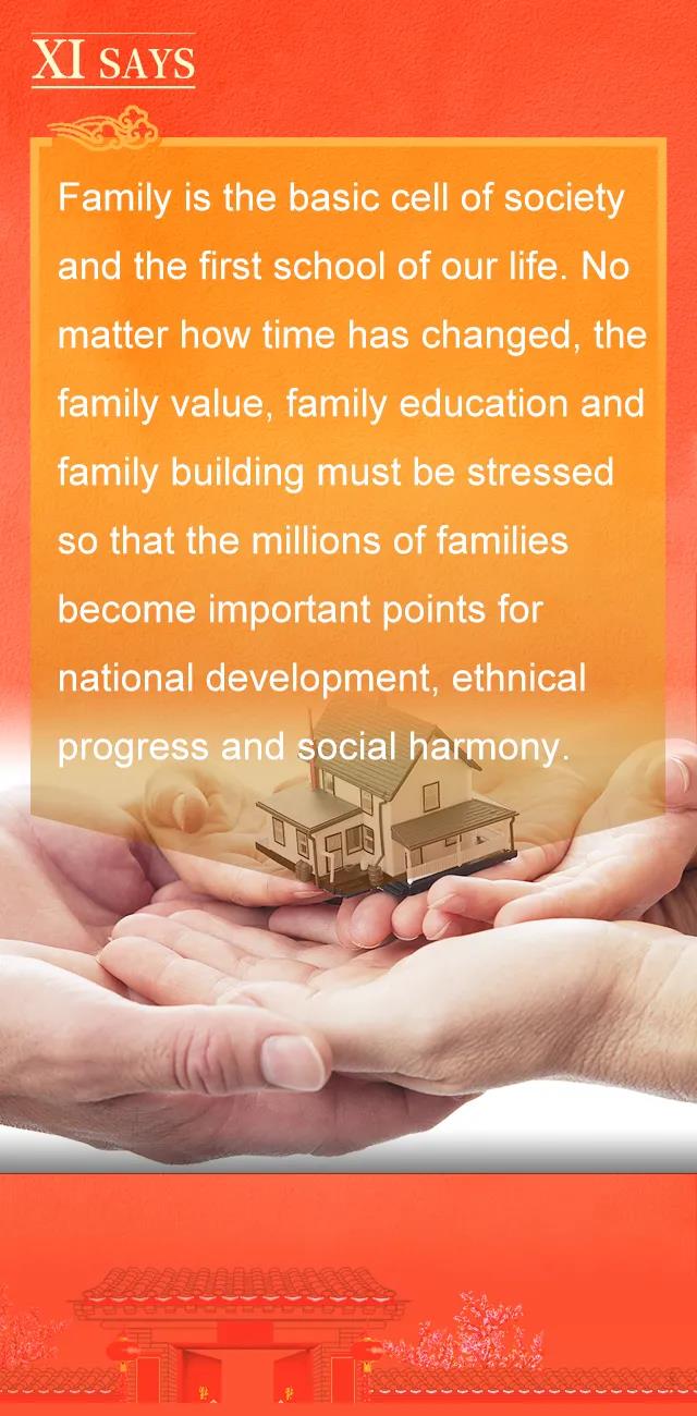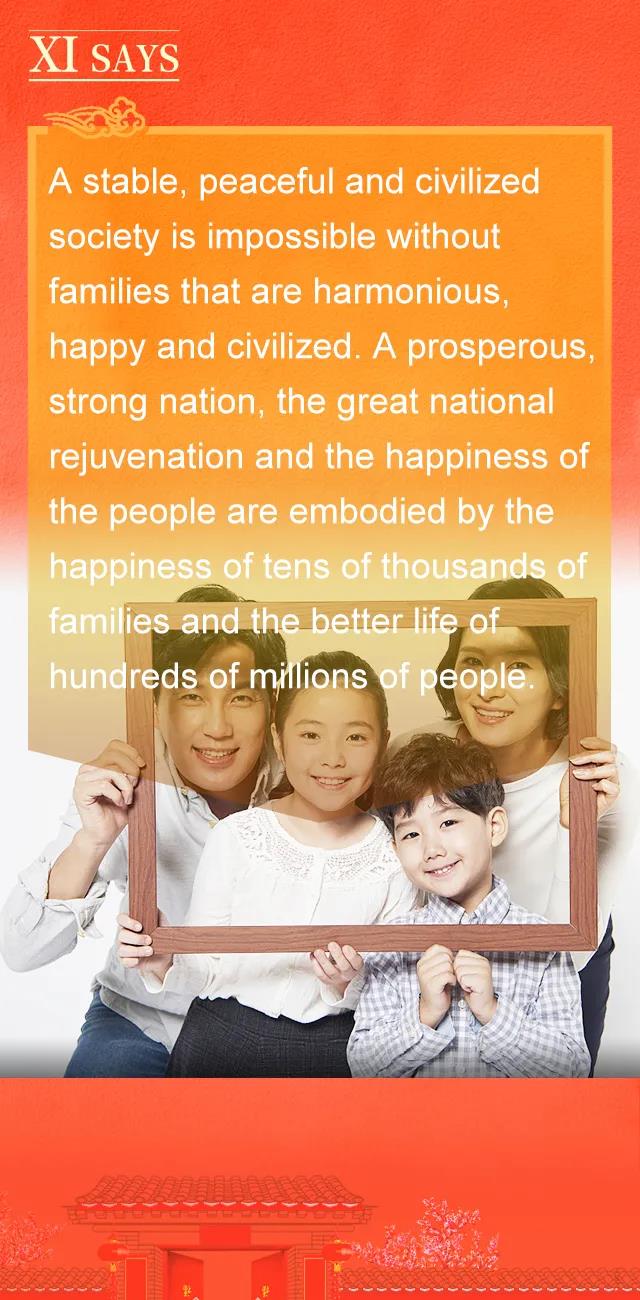 家庭和睦则社会安定,家庭幸福则社会祥和,家庭文明则社会文明。国家富强,民族复兴,人民幸福,不是抽象的,最终要体现在千千万万个家庭都幸福美满上,体现在亿万人民生活不断改善上。