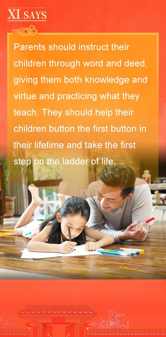 广大家庭都要重言传、重身教,教知识、育品德,身体力行、耳濡目染,帮助孩子扣好人生的第一粒扣子,迈好人生的第一个台阶。