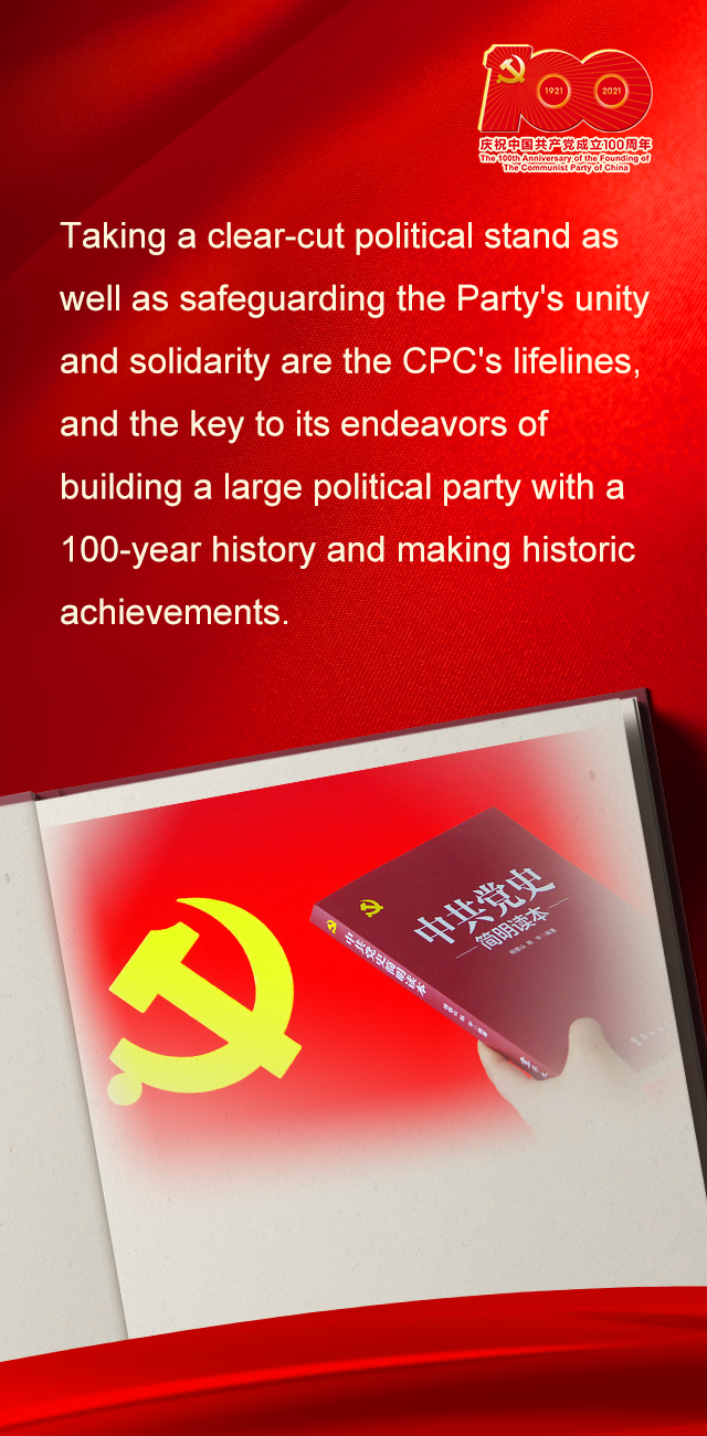 旗帜鲜明讲政治、保证党的团结和集中统一是党的生命,也是我们党能成为百年大党、创造世纪伟业的关键所在。