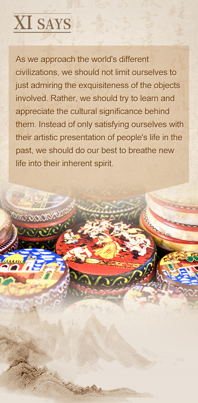 对待不同文明,不能只满足于欣赏它们产生的精美物件,更应该去领略其中包含的人文精神;不能只满足于领略它们对以往人们生活的艺术表现,更应该让其中蕴藏的精神鲜活起来。