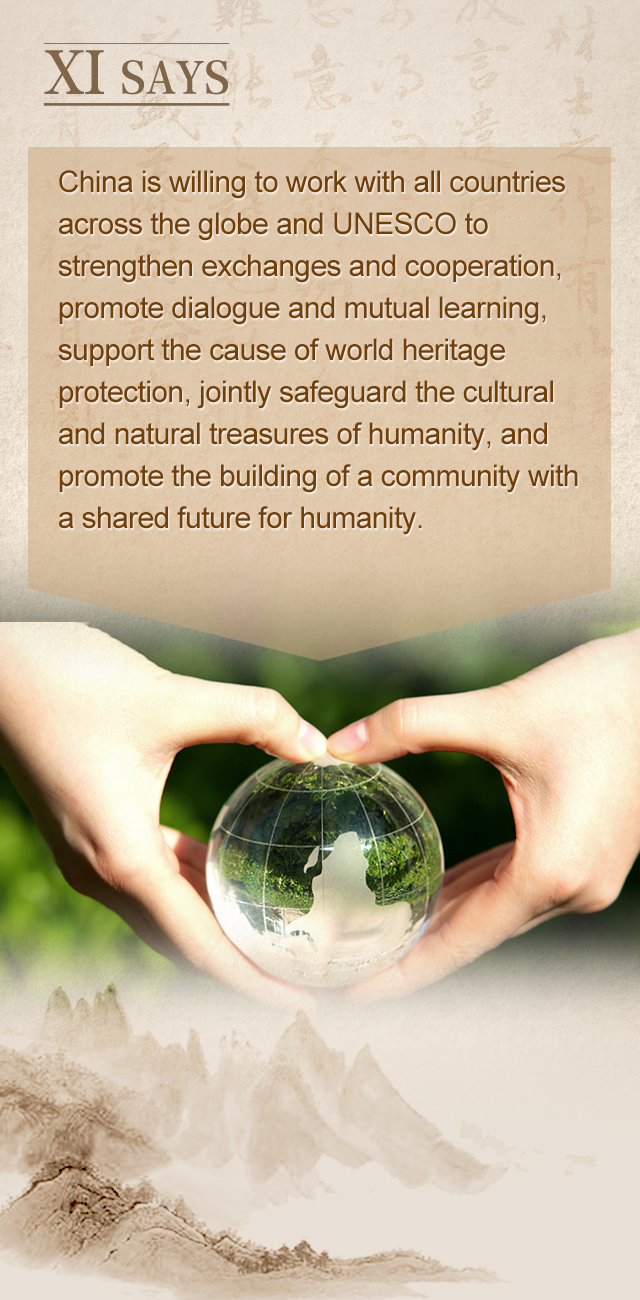 中国愿同世界各国和联合国教科文组织一道,加强交流合作,推动文明对话,促进交流互鉴,支持世界遗产保护事业,共同守护好全人类的文化瑰宝和自然珍宝,推动构建人类命运共同体。