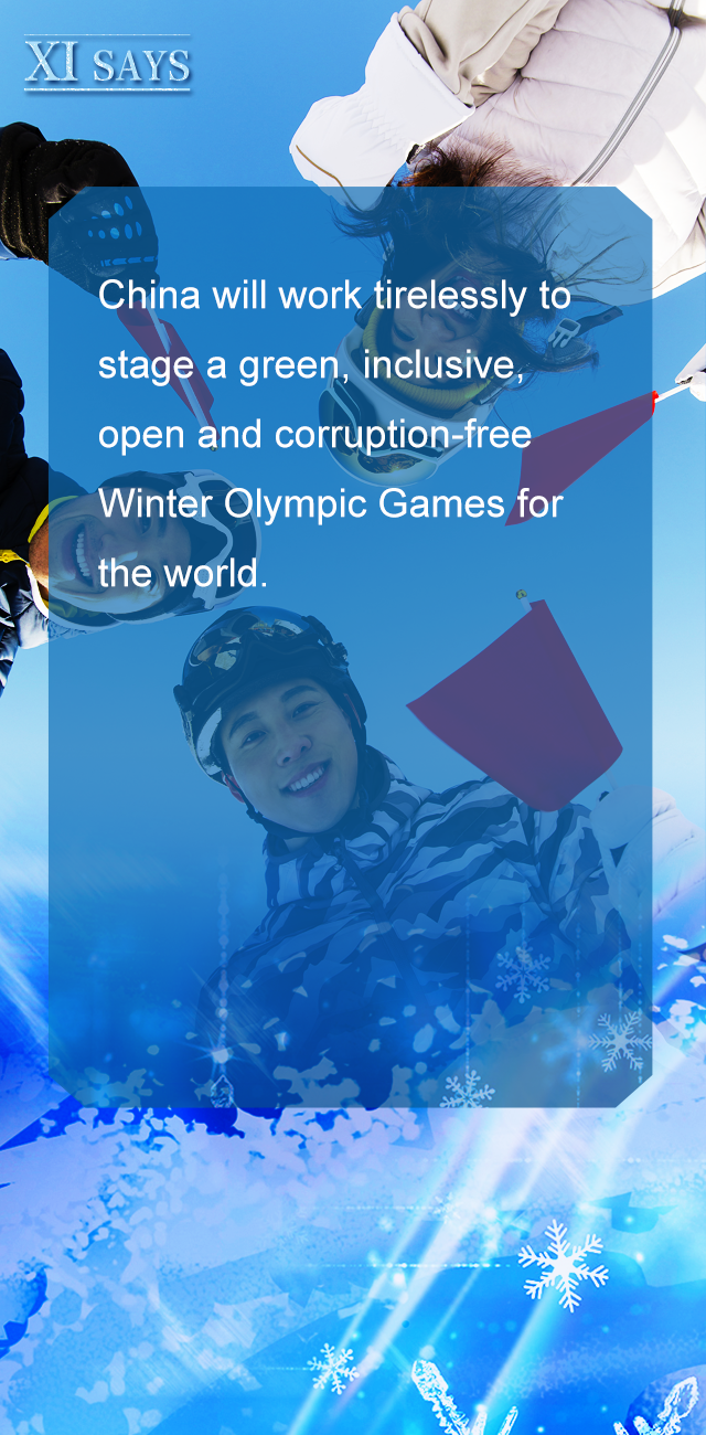 我们一定会积极努力,为世界呈现一届绿色、共享、开放、廉洁的冬奥会。