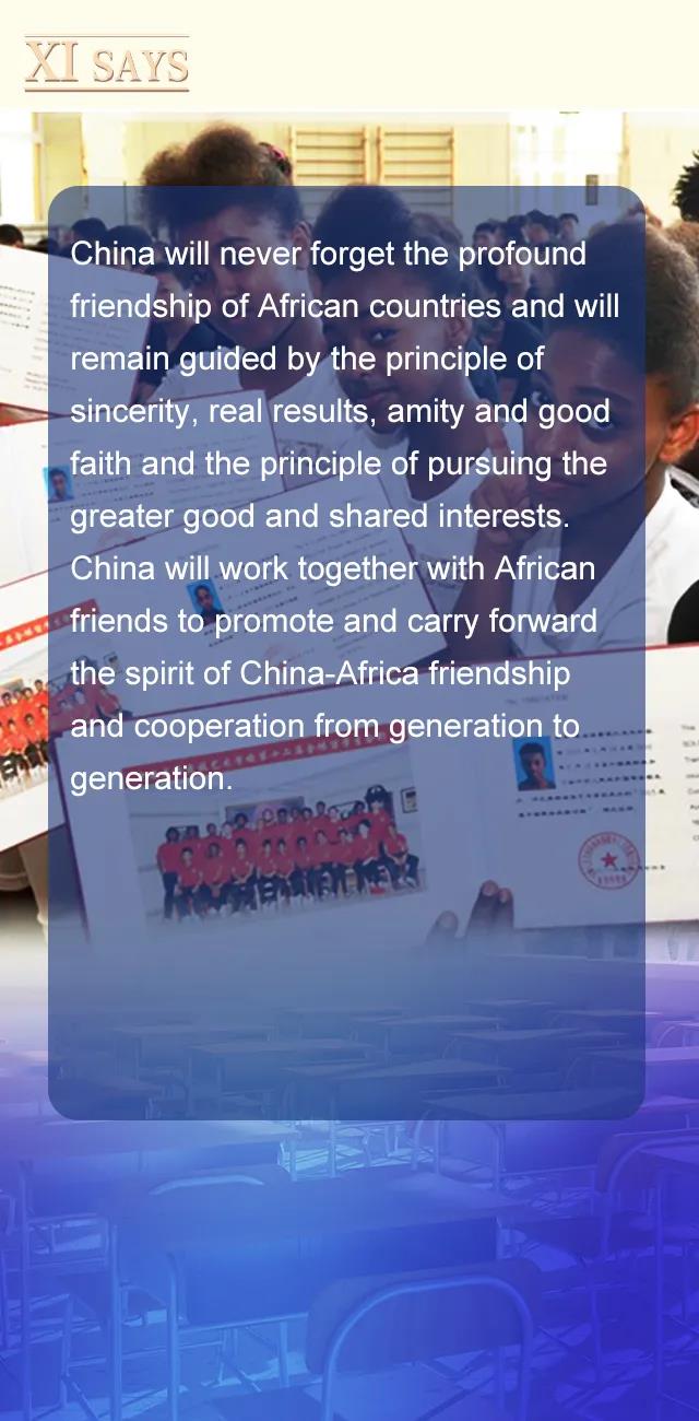 中国永远不会忘记非洲国家的深情厚谊,将继续秉持真实亲诚理念和正确义利观,同非洲朋友一道,让中非友好合作精神代代相传、发扬光大。