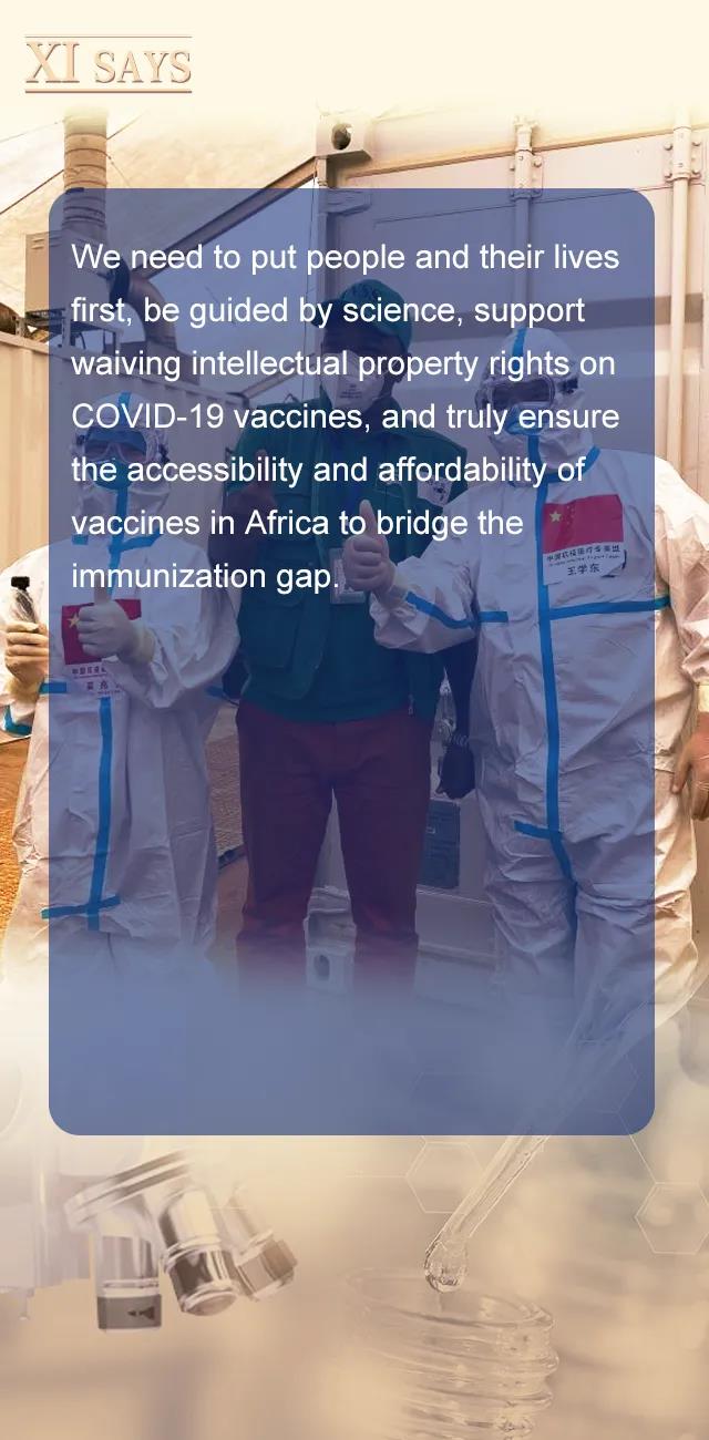 我们要坚持人民至上、生命至上,弘扬科学精神,支持疫苗知识产权豁免,切实保障疫苗在非洲的可及性和可负担性,弥合“免疫鸿沟”。