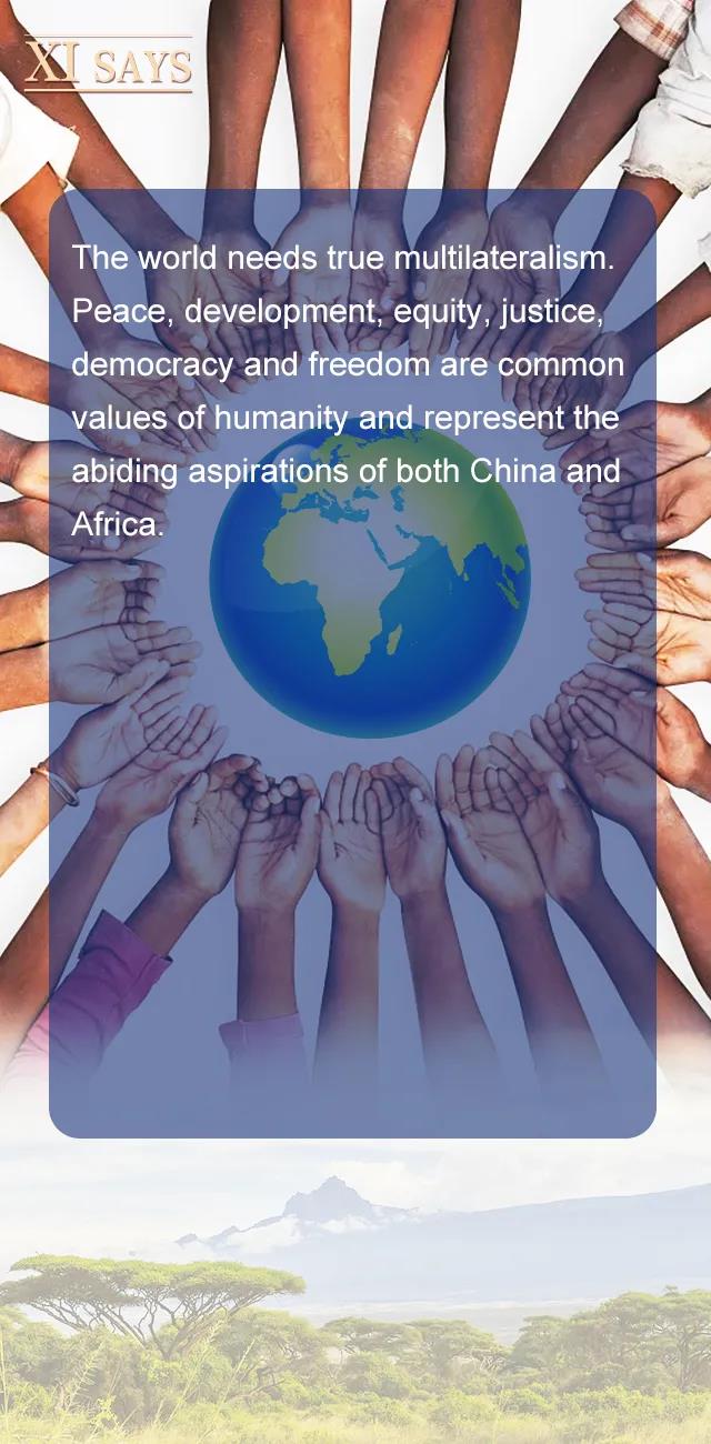 世界需要真正的多边主义。和平、发展、公平、正义、民主、自由是全人类的共同价值,是中非双方孜孜以求的共同目标。