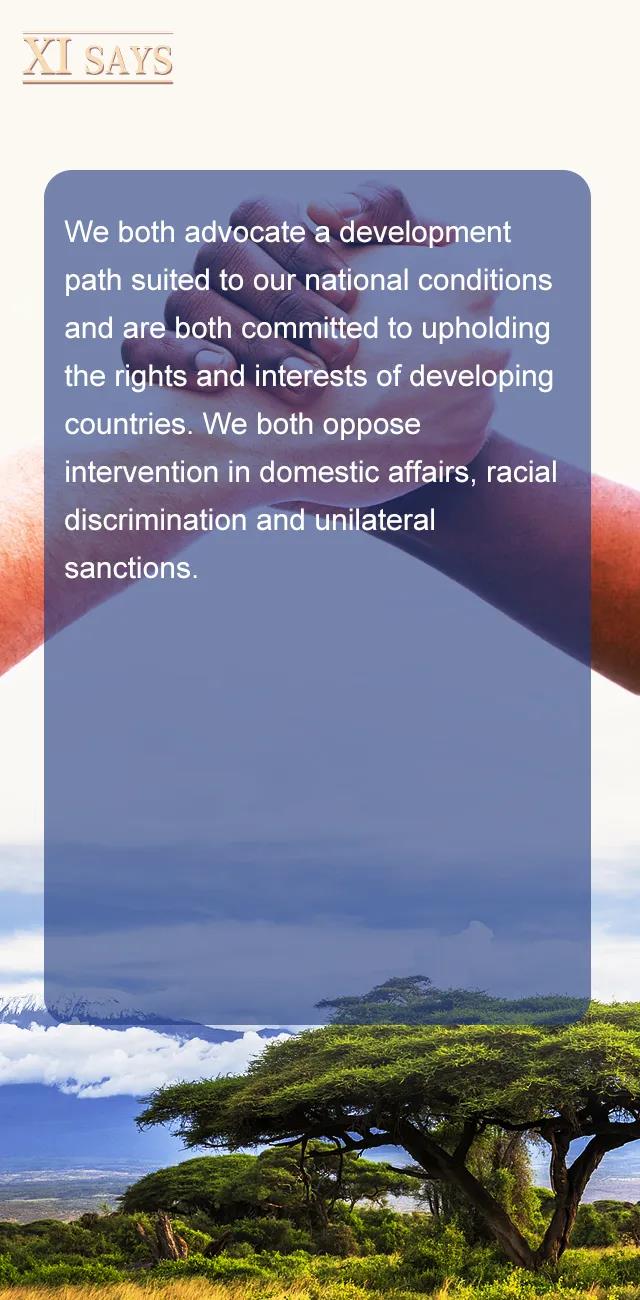 我们都主张走符合自身国情的发展道路,都致力于维护发展中国家权益,都反对干涉内政、种族歧视、单边制裁。