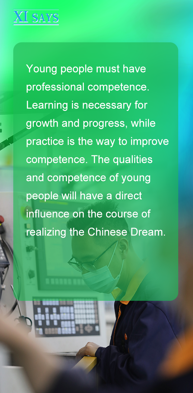 广大青年一定要练就过硬本领。学习是成长进步的阶梯,实践是提高本领的途径。青年的素质和本领直接影响着实现中国梦的进程。